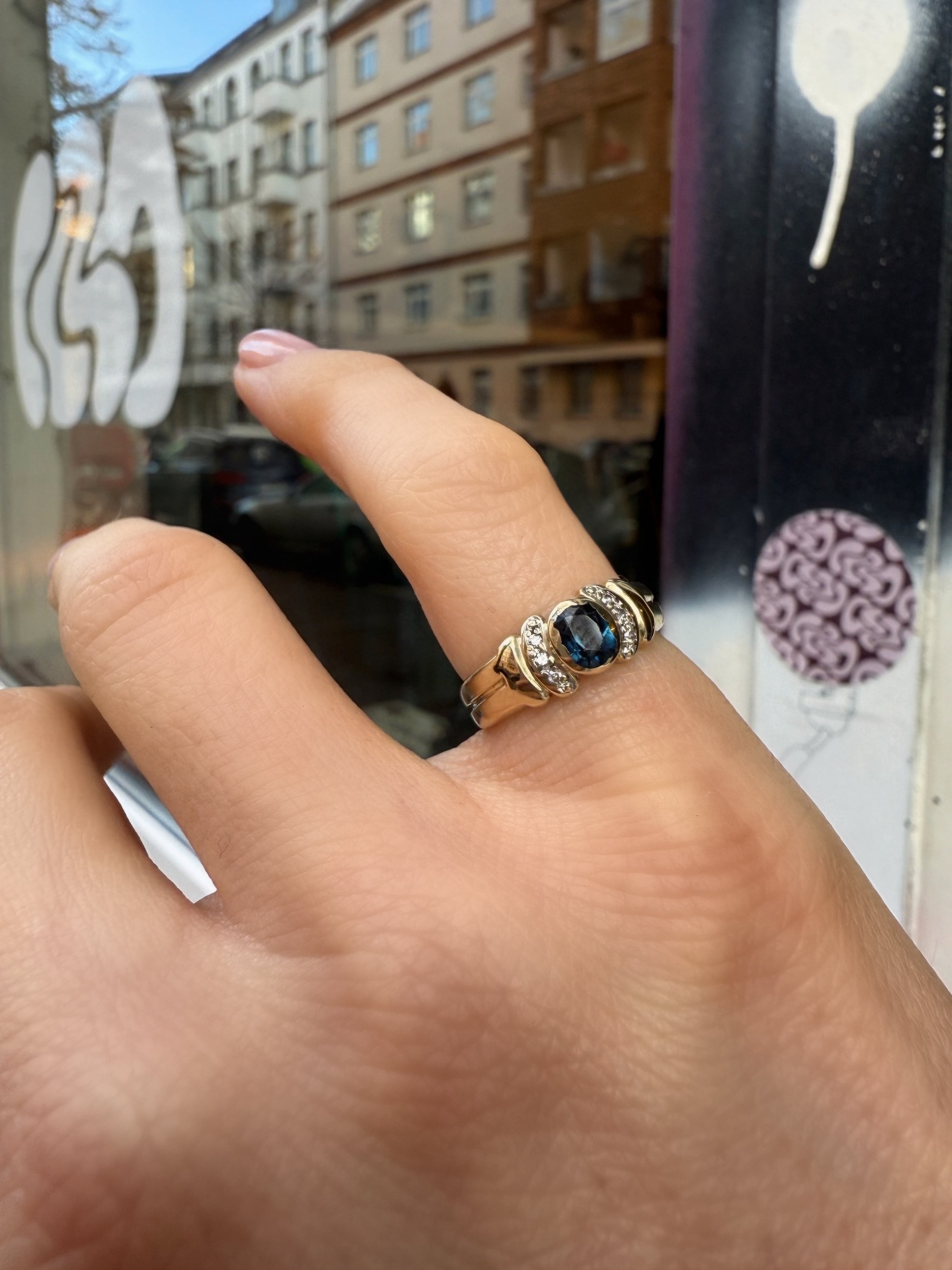 #201 8k Ring mit Saphir und 6 Diamanten - RG 55